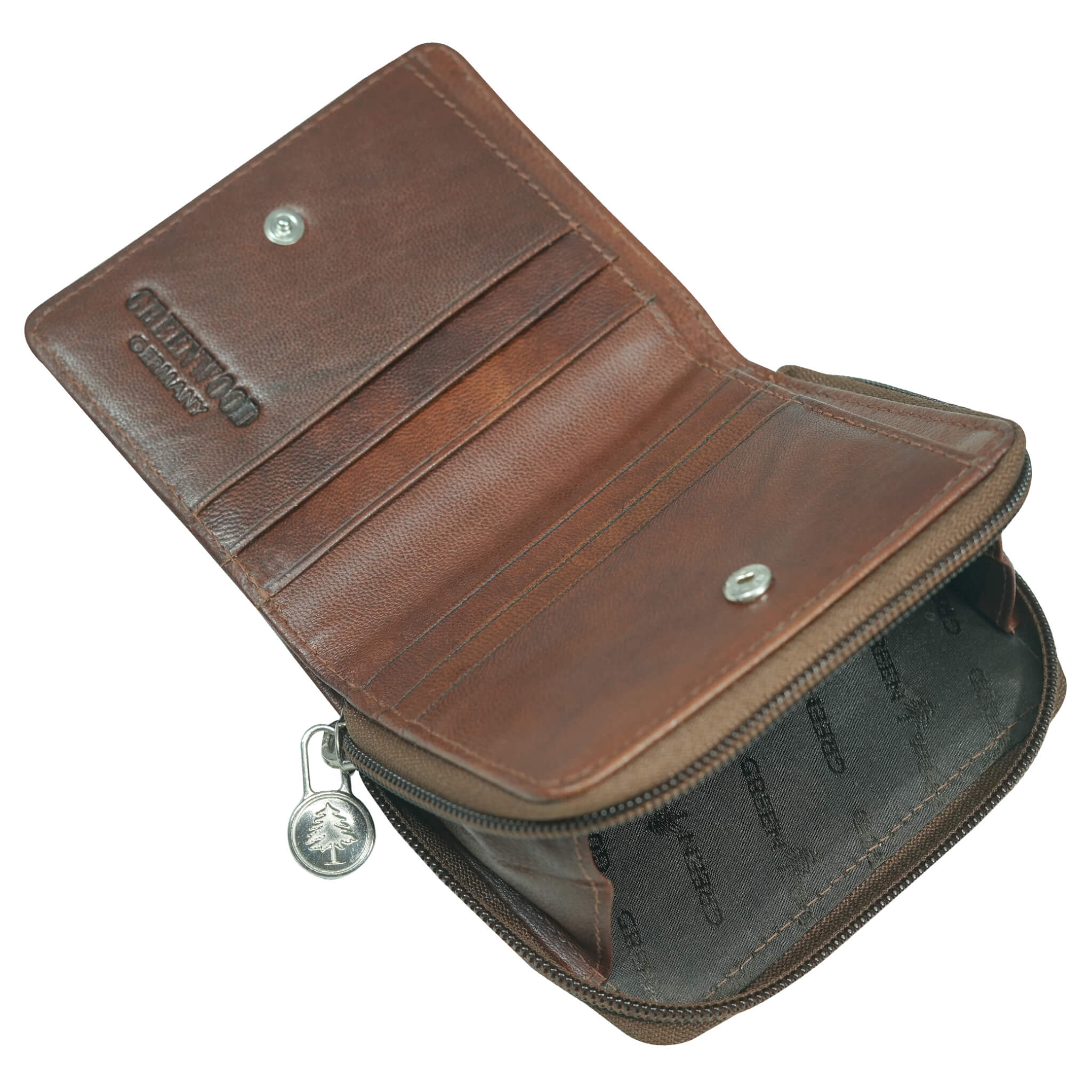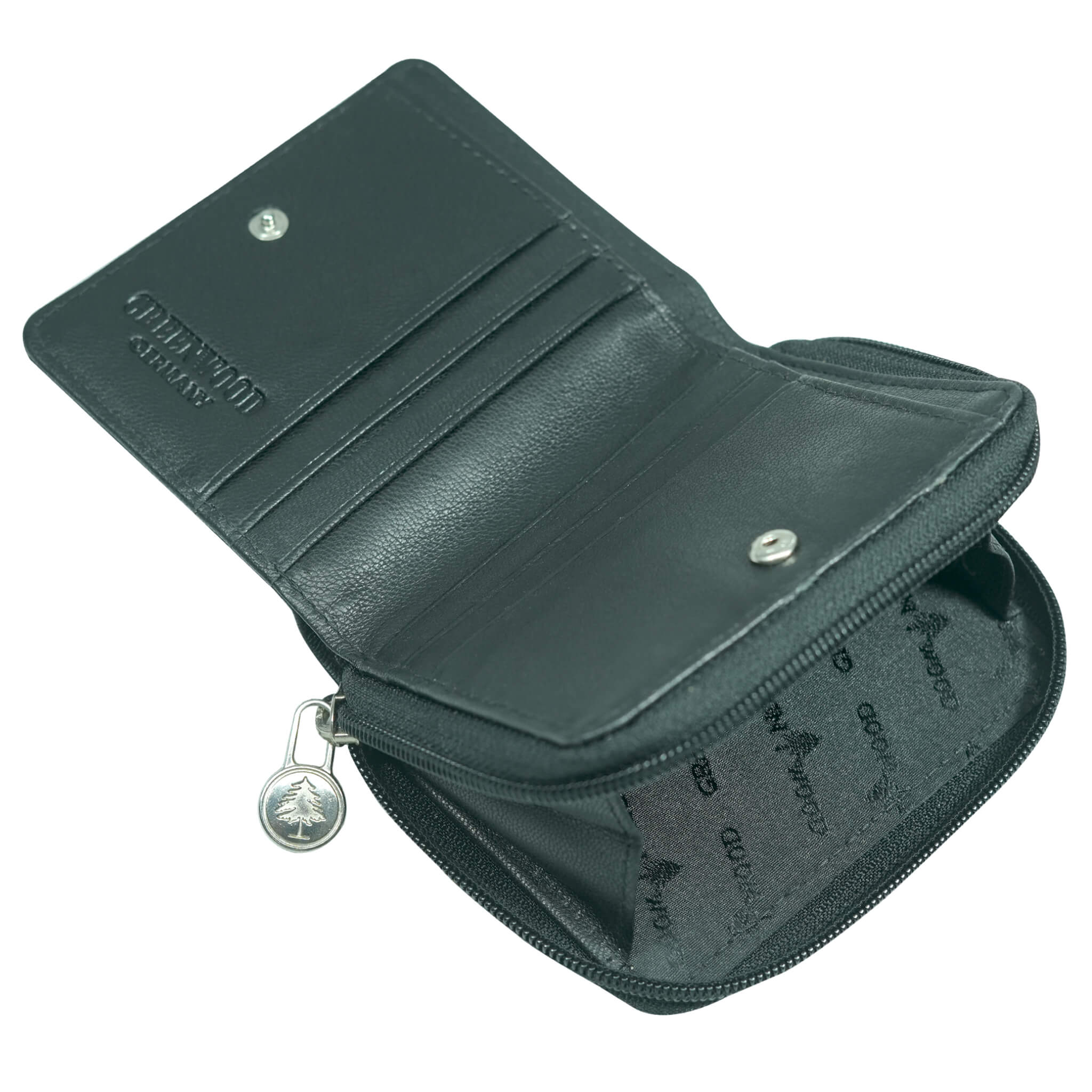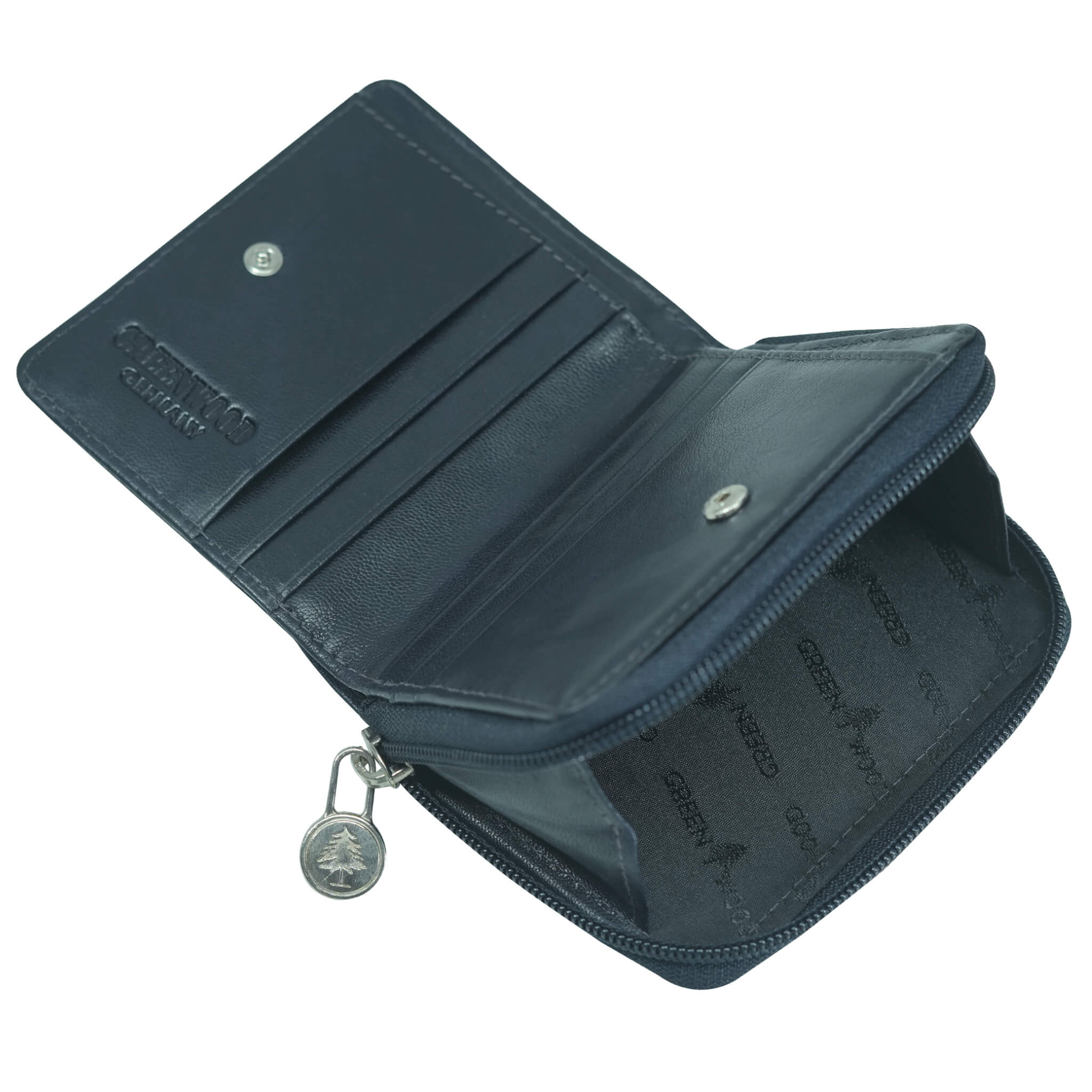 Snap closure. - Embossed Greenwood tree logo and color-coordinated, durable lining.